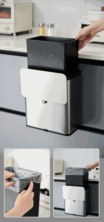 【آویزان شدن بدون سوراخ】 سطل زباله دیواری را میتوان با قلاب یا نوار چسب قابل جدا شدن به درب کابینت آشپزخانه یا دیوار آویزان کرد، که برای نگهداری زبالههای مواد غذایی مناسب است و به طور موثر در فضا صرفهجویی میکند. ریل داخلی قابل شستشو: به لطف بشکه داخلی قابل جدا شدن PP، تخلیه و تمیز کردن آن آسان است، ظرف پلاستیکی را میتوان در ماشین ظرفشویی تمیز کرد. درب نیمه اتوماتیک: این محصول اولین کاربرد ساختار پوشش کشویی در سطل زباله خانگی است.